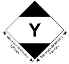 The marking shall be readily visible, legible and able to withstand open weather exposure without a substantial reduction in effectiveness. The marking shall be in the form of a square set at an angle of 45° (diamond-shaped). The top and bottom portions and the surrounding line shall be black. The centre area shall be white or a suitable contrasting background. The minimum dimensions shall be 100 mm x 100 mm and the minimum width of the line forming the diamond shall be 2 mm. The symbol "Y" shall be placed in the centre of the mark and shall be clearly visible. Where dimensions are not specified, all features shall be in approximate proportion to those shown. If the size of the package so requires, the minimum outer dimensions shown above may be reduced to be not less than 50 mm x 50 mm provided the marking remains clearly visible. The minimum width of the line forming the diamond may be reduced to a minimum of 1 mm. The symbol "Y" shall remain in approximate proportion to that shown above. |