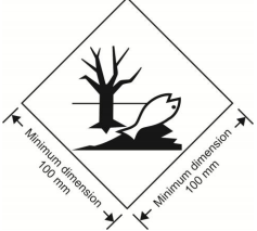 The marking shall be in the form of a square set at an angle of 45° (diamond-shaped). The symbol (fish and tree) shall be black on white or suitable contrasting background. The minimum dimensions shall be 100 mm x 100 mm and the minimum width of line forming the diamond shall be 2 mm. If the size of the package so requires, the dimensions/line thickness may be reduced, provided the marking remains clearly visible. Where dimensions are not specified, all features shall be in approximate proportion to those shown. |
